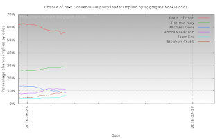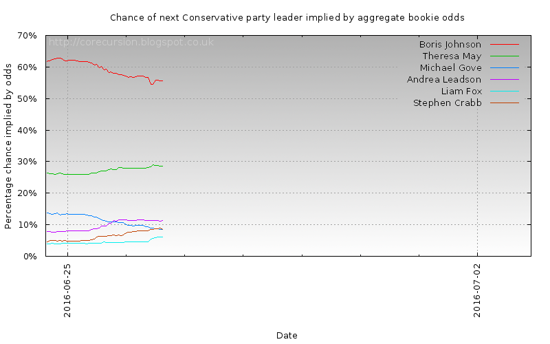 Odds given across various bookmakers (10bet, 32red, 888sport, bet365, betdaq, betfair, betfred, betvictor, betway, boylesports, bwin, coral, ladbrokes, marathon bet, matchbook, netbet, paddypower, skybet, sportingbet, stanjames, totesport, unibet, williamhill, winner) are meaned and then inverted to give the rough chance bookies as a gestalt reckon each candidate has.
